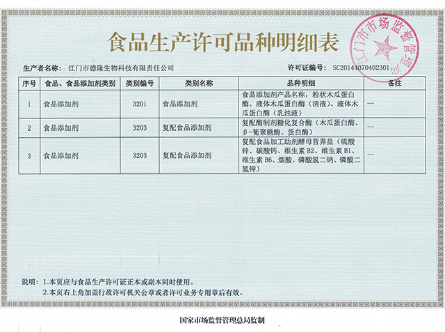 江门市德隆生物科技有限责任公司是高科技民营企业,生产经営的啤酒添加剂系列产品有:宝莲牌木瓜蛋白酶(高活力液体木瓜蛋白酶——糖化专用、酶清——清酒专用、粉状木瓜蛋白酶——水解动植物蛋白质专用);糖化复合酶;酵母营养盐;中性蛋白酶、β-葡聚糖酶、木聚糖酶等。